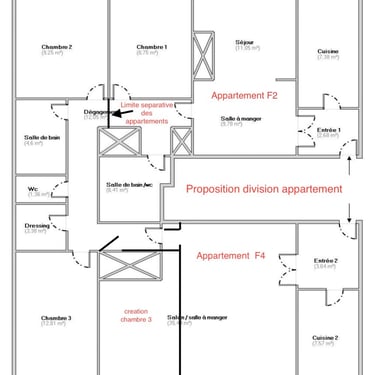 Découvrez les photos du bien initial et du bien transformé. Création de 3 chambres dans l'espace salon/salle à manger, rénovation cuisine, WC et salle de douche !!!
