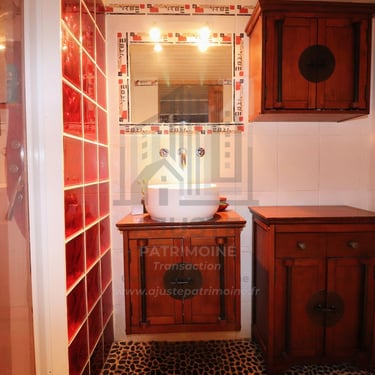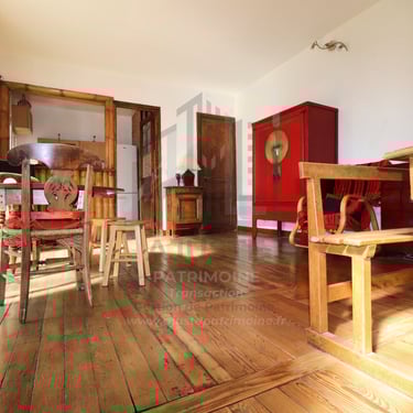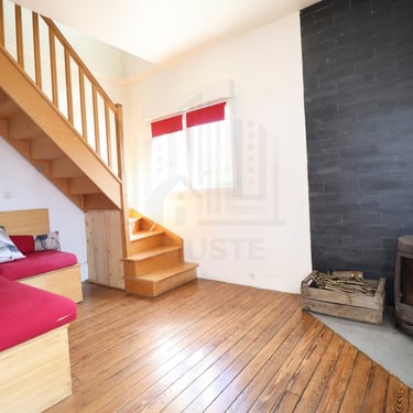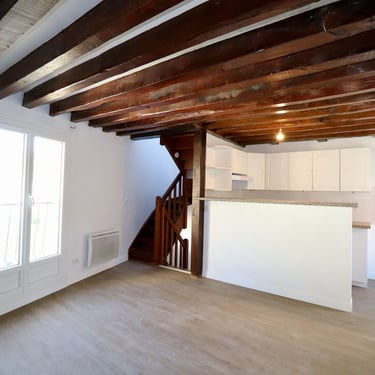 Au 1er étage : Une cuisine américaine avec bar, aménagée et équipée ouverte sur le séjour. Une pièce de vie charmante et agréable avec poutre apparentes et grandes fenêtres double vitrage récentes.